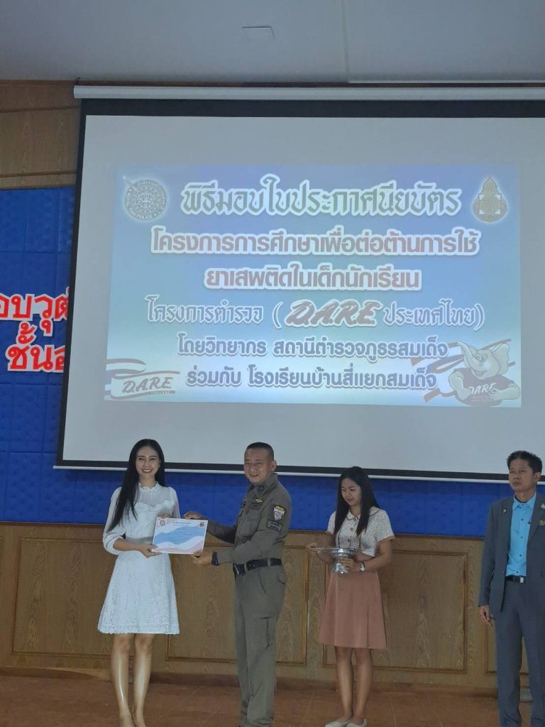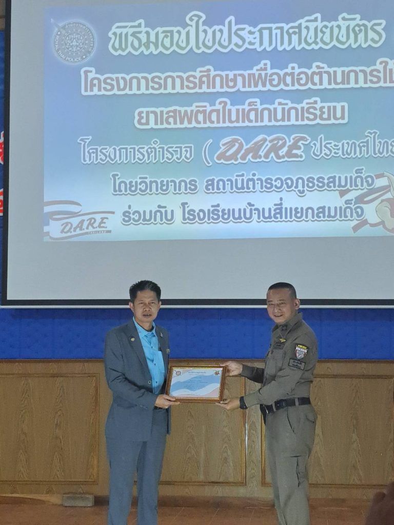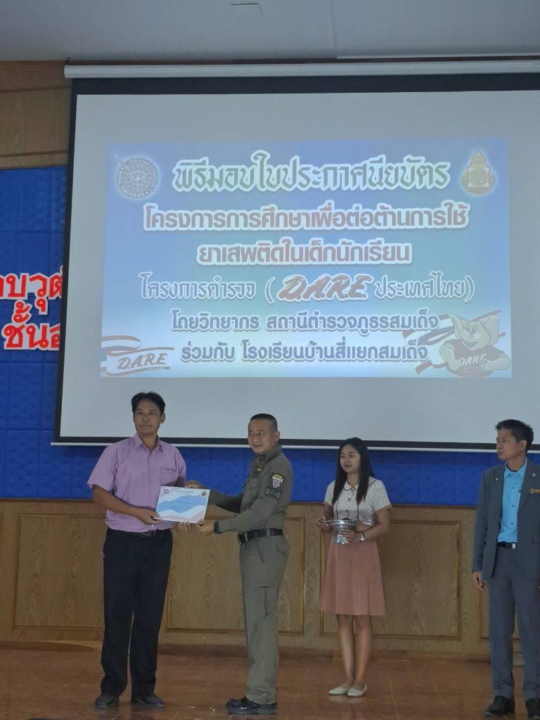 พ.ต.อ.รัตนสุข คำวงศ์ ผกก.สภ.สมเด็จ มอบหมายให้ พ.ต.ท.มีเกียรติ ประพฤติดี สวป.สภ.สมเด็จ,ร.ต.อ.วิมล ทองยืน รอง สว.(ป.) สภ.สมเด็จ ครูตำรวจแดร์ มอบใบประกาศนียบัตรแดร์/ มอบรางวัลเรียงความแดร์ดีเด่น รางวัลวาดภาพการต่อต้านยาเสพติดให้กับนักเรียน โรงเรียนบ้านสี่แยกสมเด็จ พร้อมมอบใบประกาศเกียรติคุณให้ครูที่สนับสนุนโครงการ D.A.R.E.