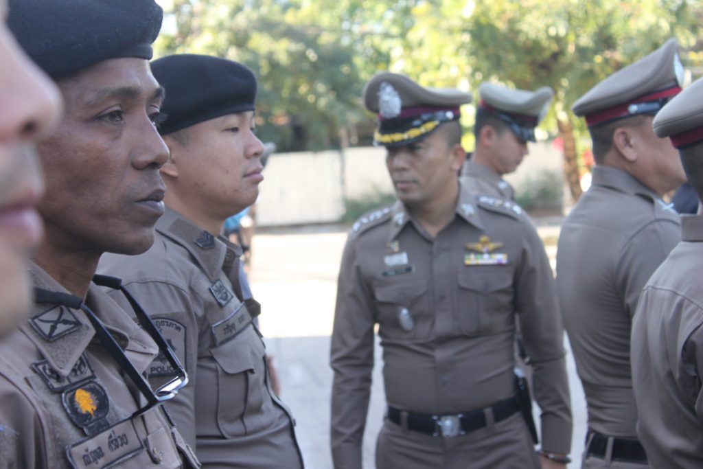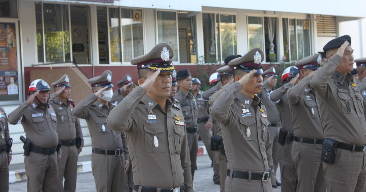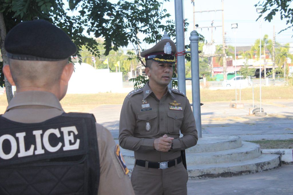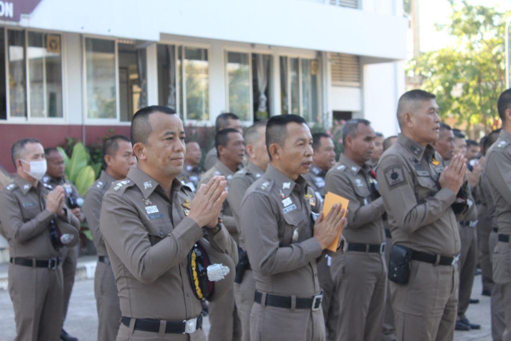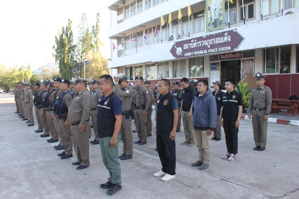 นำแถว ข้าราชการตำรวจ สภ.สมเด็จ เข้าแถวเคารพธงชาติ สวดมนต์ไหว้พระ กล่าวคำปฏิญาณตน และอุดมคติตำรวจ ตรวจเครื่องแต่งกาย พร้อมแจ้งข้อราชการที่สำคัญให้ผู้ใต้บังคับบัญชาทราบ