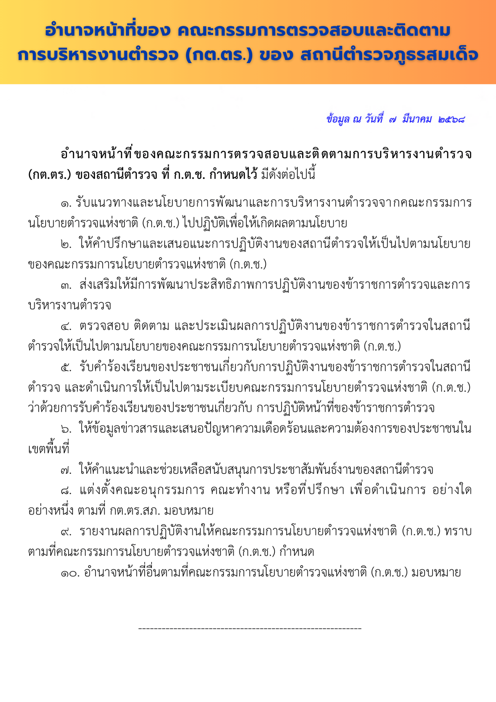 อำนาจหน้าที่ของคณะกรรมการตรวจสอบและติดตามการบริหารงานตำรวจ (กต.ตร.) ของสถานีตำรวจ ที่ ก.ต.ช. กำหนดไว้ มีดังต่อไปนี้